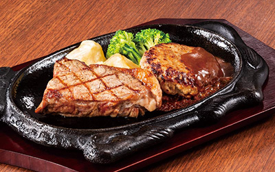 厚切りサーロインステーキとビーフ100%ハンバーグがコンビになった充実の1品